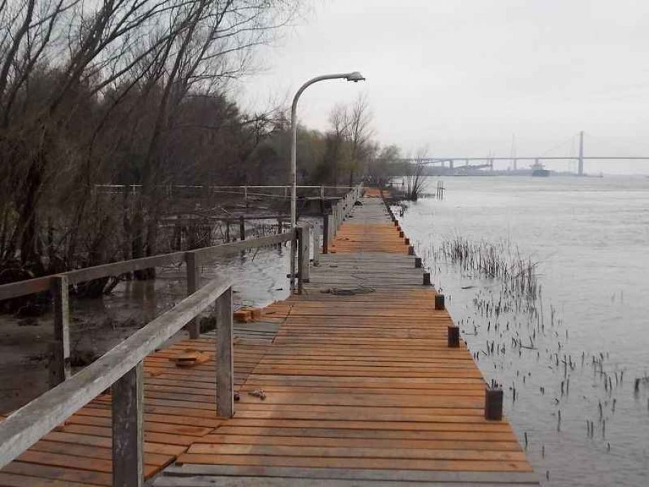 Con un trabajo que asombra, Rafael nos envía fotos de la mañana del viernes 5 de agosto cuando nuevamente empezó a diluviar mostrándonos las muy avanzadas obras de reconstrucción del muelle y pasarelas de acceso al mismo con la baranda ya colocada y farolas en posición.
