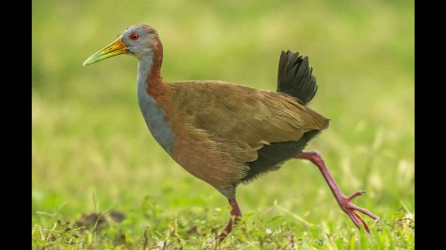 43-46 cm. Pico amarillo verdoso. Patas rojas. Cara gris. Corona pardo grisácea. Nuca y cuello dorsal rojizos. Dorso pardo oliváceo. Garganta blanca. Cuello anterior y pecho grises. Resto de ventral ocre rosado. Flancos y subcaudales negras. Primarias rojizas. Secundarias oliváceas. Cubiertas alares pardo oliváceas. |