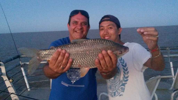 Esta foto guarda una rareza. Gustavo Caputo es quien capturoóesta boga, que para sorpresa de Ariel Miyashiro tenía clavado un anzuelaoue recién terminaba de perder en una clavada fallida.
