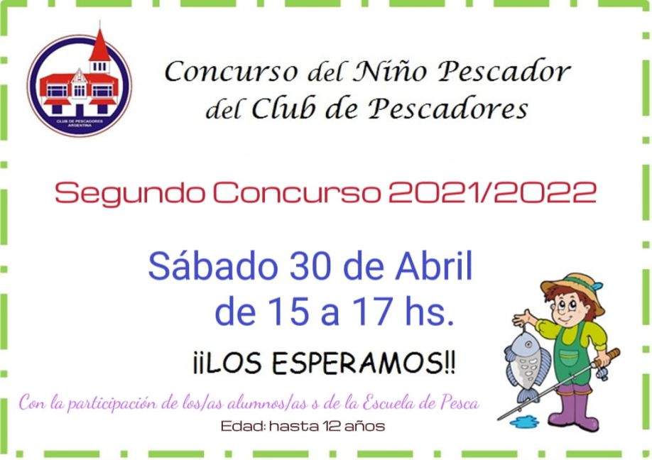 El próximo sábado 30 de abril desde las 15 horas se realizará en nuestra sede central una nueva edición del Concurso del Niño Pescador. El mismo se desarrollará para las categorías de patíes y dorados en dos tiempos de una hora con un descanso donde los chicos recibirán un refrigerio.