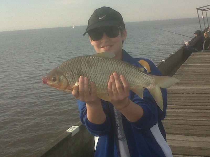 Amigos, les mando una foto de mi hijo Ezequiel Safdie , niño pescador que participó de la escuelita, y con lo allí aprendido pescó esta hermosa Boga de 50cm aprox el Sábado 31/8/13 en un día espectacular en el muelle...
